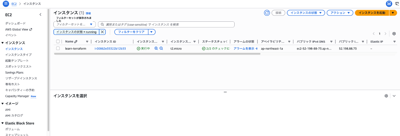 terraform: テラフォームとプロバイダーのバージョン指定provider: プロバイダーを操作するための共通の設定(リージョンなど)data: プロバイダーからすでにあるデータを取得するための設定(AMIなど)resource: インフラの構成要素を設定(ここではEC2インスタンスを作成)